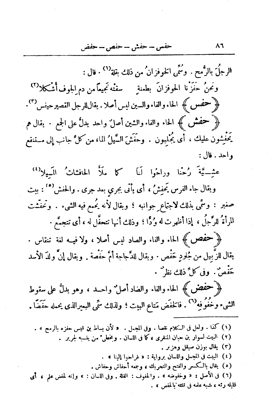 (حَفَشَ) الْحَاءُ وَالْفَاءُ وَالشِّينُ أَصْلٌ وَاحِدٌ يَدُلُّ عَلَى الْجَمْعِ. يُقَالُ هُمْ يَحْفِشُونَ عَلَيْكَ، أَيْ يُجْلِبُونَ. وَحَفَشَ السَّيْلُ الْمَاءَ مِنْ كُلِّ جَانِبٍ إِلَى مُسْتَنْقَعٍ وَاحِدٍ. قَالَ: