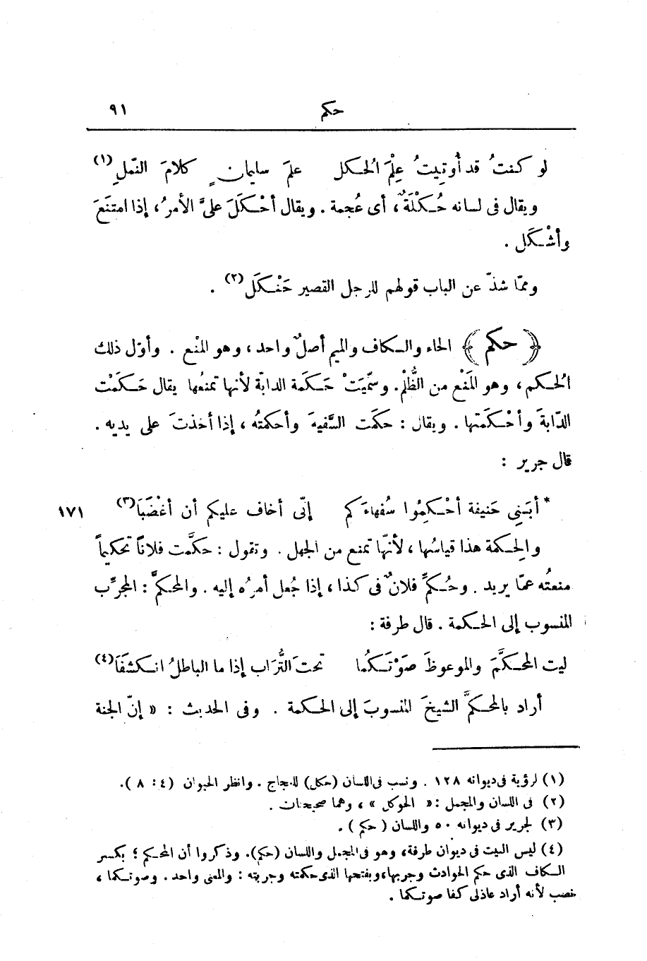 وَالْحِكْمَةُ هَذَا قِيَاسُهَا، لِأَنَّهَا تَمْنَعُ مِنَ الْجَهْلِ. وَتَقُولُ: حَكَّمْتُ فُلَانًا تَحْكِيمًا مَنَعْتُهُ عَمَّا يُرِيدُ. وَحُكِّمَ فُلَانٌ فِي كَذَا، إِذَا جُعِلَ أَمْرُهُ إِلَيْهِ. وَالْمُحَكَّمُ: الْمُجَرِّبُ الْمَنْسُوبُ إِلَى الْحِكْمَةِ. قَالَ طَرَفَةُ: