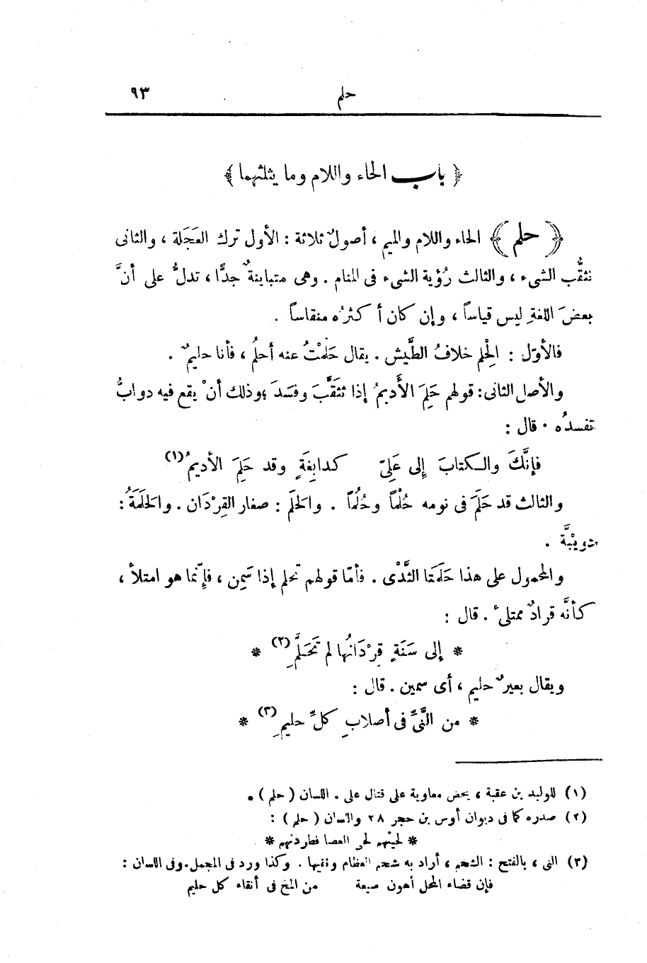 (حَلَمَ) الْحَاءُ وَاللَّامُ وَالْمِيمُ، أُصُولٌ ثَلَاثَةٌ: الْأَوَّلُ تَرْكُ الْعَجَلَةَ، وَالثَّانِي تَثَقُّبُ الشَّيْءِ، وَالثَّالِثُ رُؤْيَةُ الشَّيْءِ فِي الْمَنَامِ. وَهِيَ مُتَبَايِنَةٌ جِدًّا، تَدُلُّ عَلَى أَنَّ بَعْضَ اللُّغَةِ لَيْسَ قِيَاسًا، وَإِنْ كَانَ أَكْثَرُهُ مُنْقَاسًا.
