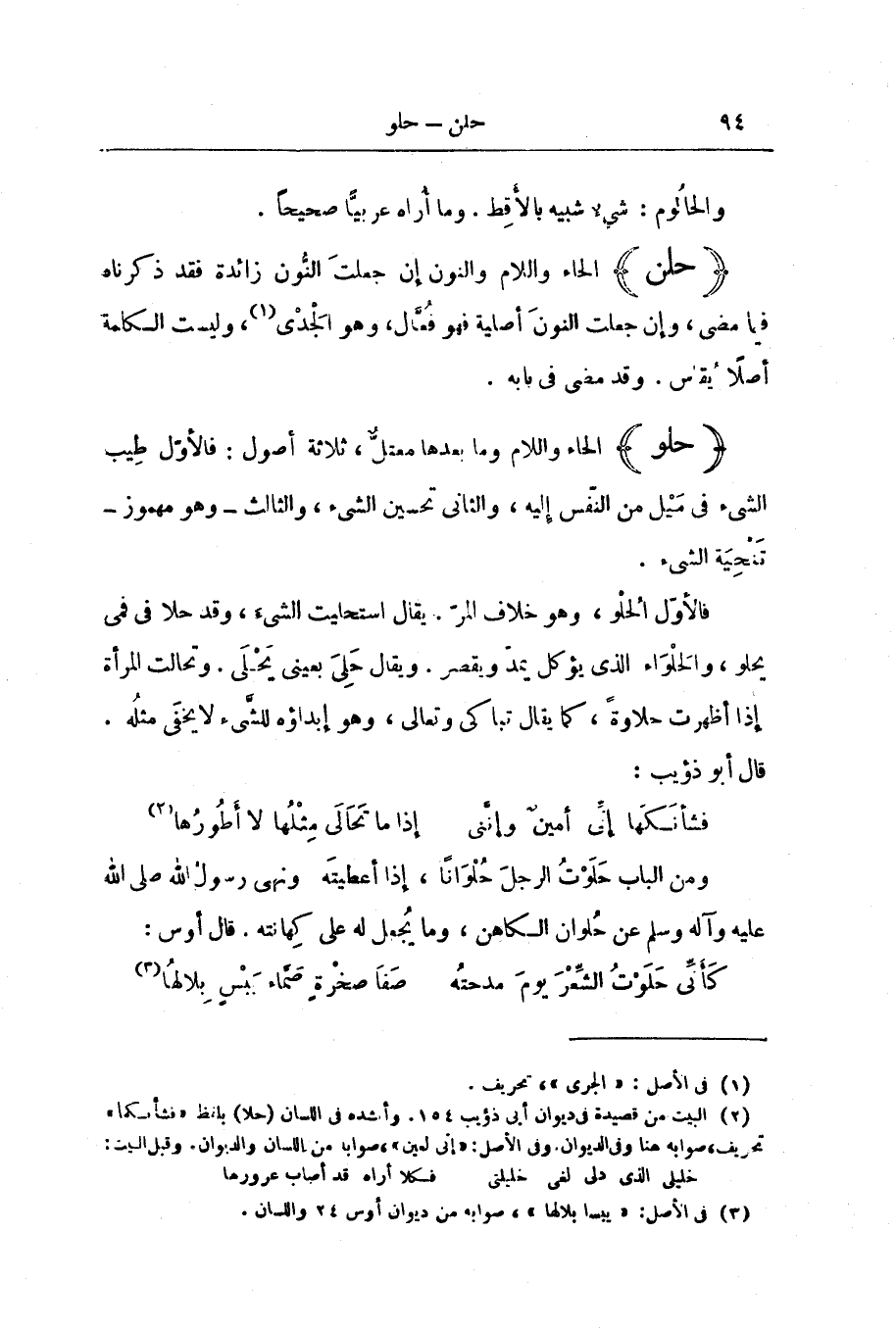 فَالْأَوَّلُ الْحُلْوُ، وَهُوَ خِلَافُ الْمُرِّ. يُقَالُ اسْتَحْلَيْتُ الشَّيْءَ، وَقَدْ حَلَا فِي فَمِي يَحْلُو، وَالْحَلْوَاءُ الَّذِي يُؤْكَلُ يُمَدُّ وَيُقْصَرُ. وَيُقَالُ حَلِيَ بِعَيْنِي يَحْلَى. وَتَحَالَتِ الْمَرْأَةُ إِذَا أَظْهَرَتْ حَلَاوَةً، كَمَا يُقَالُ تَبَاكَى وَتَعَالَى، وَهُوَ إِبْدَاؤُهُ لِلشَّيْءِ لَا يُخْفَى مَثَلُهُ. قَالَ أَبُو ذُؤَيْبٍ:
