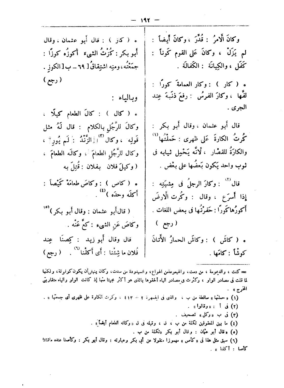 (¬4) فى أ: «فات» بالفاء الموحدة وصوابه ما أثبت وفى التهذيب 10/ 385 واللسان/ كفى: «ابن الأعرابى «الكفى: الأقوات: واحدتها: كفية بضم الكاف، وقد جاء بالفاء الموحدة كذلك فى ق، ع.