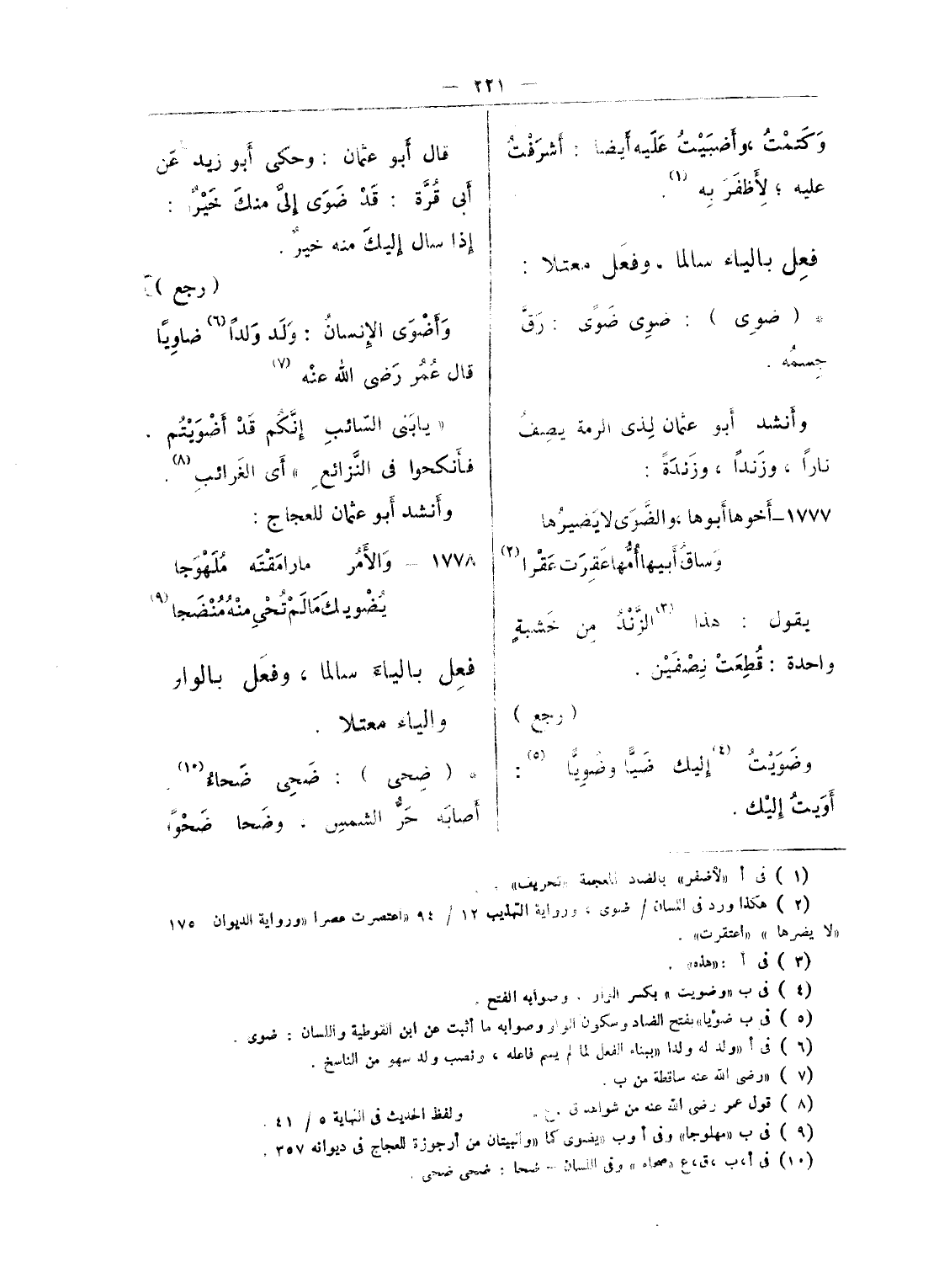 (¬1) جاء فى هامش أ، ب حاشية نصها: «قال أبو حاتم فى كتابه المبوب فى لحن العامة يقال: «ضننت تضن ضنا بفتح الضاد، وكسر النون الأولى فى الماضى، وفتح الضاد فى المستقبل، وكسر الضاد فى المصدر، ولا يقال: يضن بكسر الضاد فى المستقبل، ولا ضننت بفتح النون الأول. هذا نص قوله «وجاء فى هامش النسخة ب: قال أبو عبيد فى الغريب المصنف: ضننت عليه وضننت بفتح النون وكسرها - «ووجود الحاشية الأولى فى النسختين يرجح وجودها حاشية فى النسخة الأم.