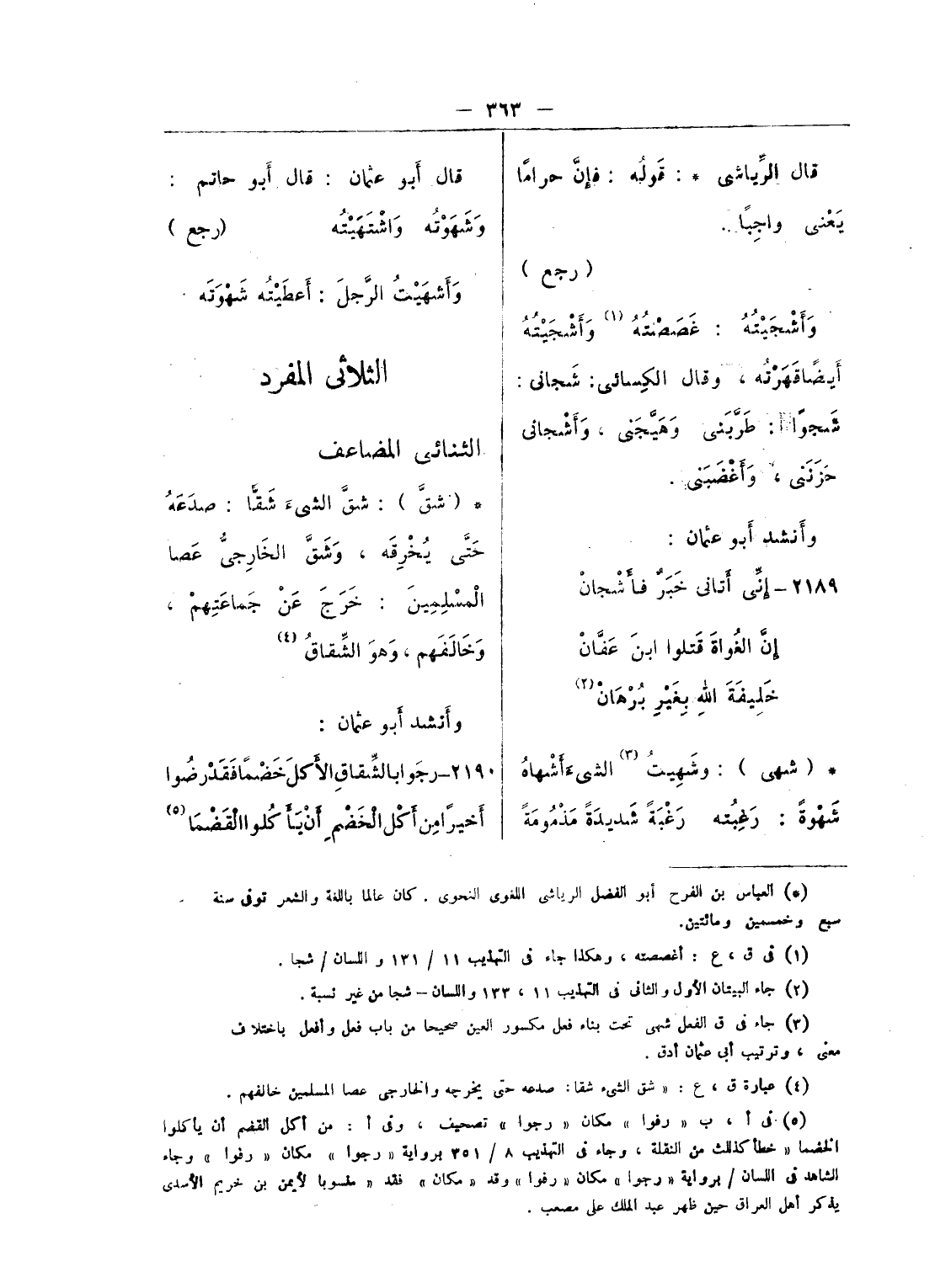 (¬4) جاء فى ق بعد مادة شت مادة شص، وقد سبق أن ذكرها فى المضاعف من باب فعل وأفعل باتفاق، واكتفى أبو عثمان بما ذكره هناك.