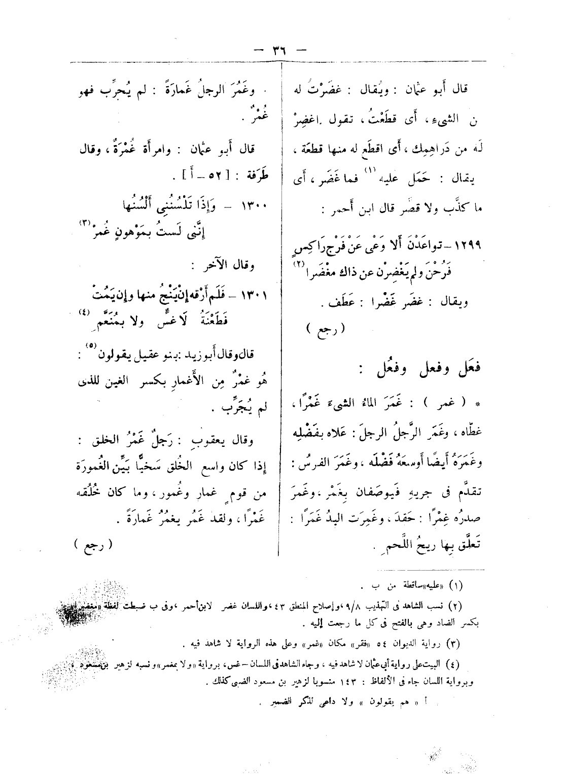 (¬4) ورد البيتان الأولان فى الجمهرة 2 - 47 والتهذيب 8 - 92. واللسان/ غنث والتاج: غنث من غير نسبة ورواية التهذيب نغسا أو اثنين «بالغين تصحيف ورواية الجمهرة واللسان «نفسه أو اثنين «ورواية التاج» نفسا أو نفسين ورواية البيت الأخير «حنبل» والجنبل: قدح ضخم من خشب، اللسان. جنبل.
