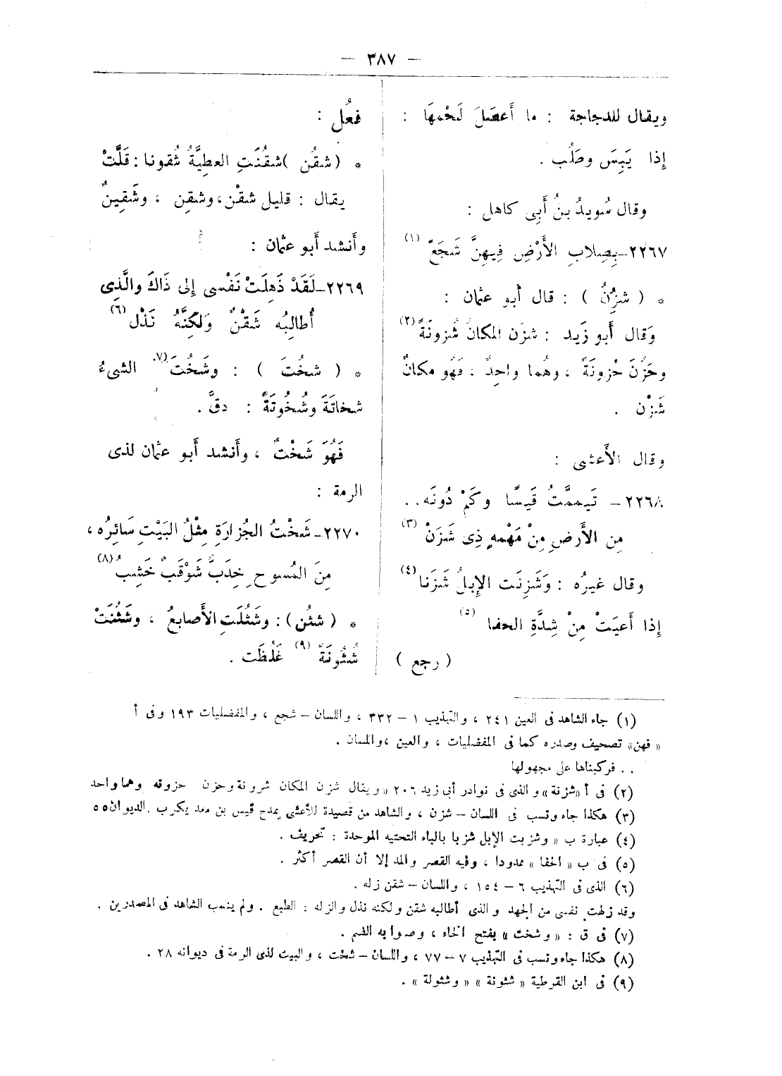 (¬4) رواية ب «زغل» بزاى معجمة وغين معجمة كذلك، وفسر بعد ذلك بالدهن ورجعت إلى اللسان فلم أجد من معانى رغل بالراء المهملة بعدها عين أو غين أو فاء أو قاف: دهن، ولم أجد من معانى زغل بالزاى المعجمة بعدها عين أو غين أو بعدها عين مهملة أو فاء أو قاف دهن ووجدت فى اللسان زعل: بزاى معجمة بعدها عين مهملة بمعنى: نشيط، ورفل براء مهملة بعدها فاء موحدة بمعنى: سيد، وزقل بزاى معجمة بعدها قاف مثناة بمعنى: إرخاء العمامة، ولم أعثر على الشاهد.