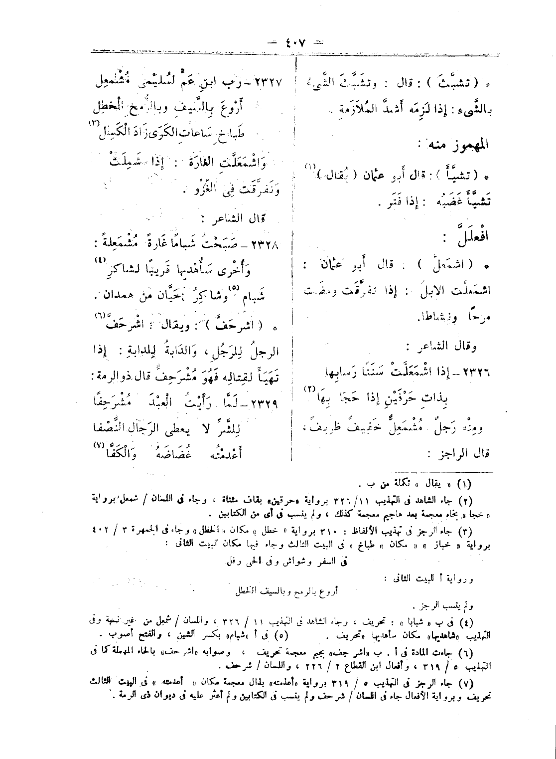 وجاء الرجز فى تهذيب الألفاظ: 96 برواية: «فأصبحت» مكان «فأقبلت» من غير نسبة، وعلق التبريزى على الشاهد بقوله: ويروى فأدبرت. والبأزلة: مشية سريعة، ومشاهلة: لحاء ومقارضة، والبأزلة مهموزة، وفى البيت لا يمكن همزها، لأن الألف تأسيس .. واستشهد ابن السكيت فى ثلاثة مواطن، لأبى السوداء العجلى «ولم أجد لأى منهما ترجمة فى الشعر والشعراء لابن قتيبة.