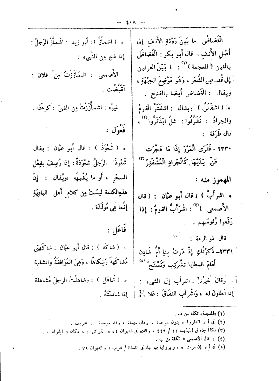 (¬6) لم يذكر ابن القوطية مادة لج هنا، وإنما ذكرها تحت بناء المضاعف من باب فعل وأفعل باختلاف وعاد أبو عثمان فكررها هناك ثانية.