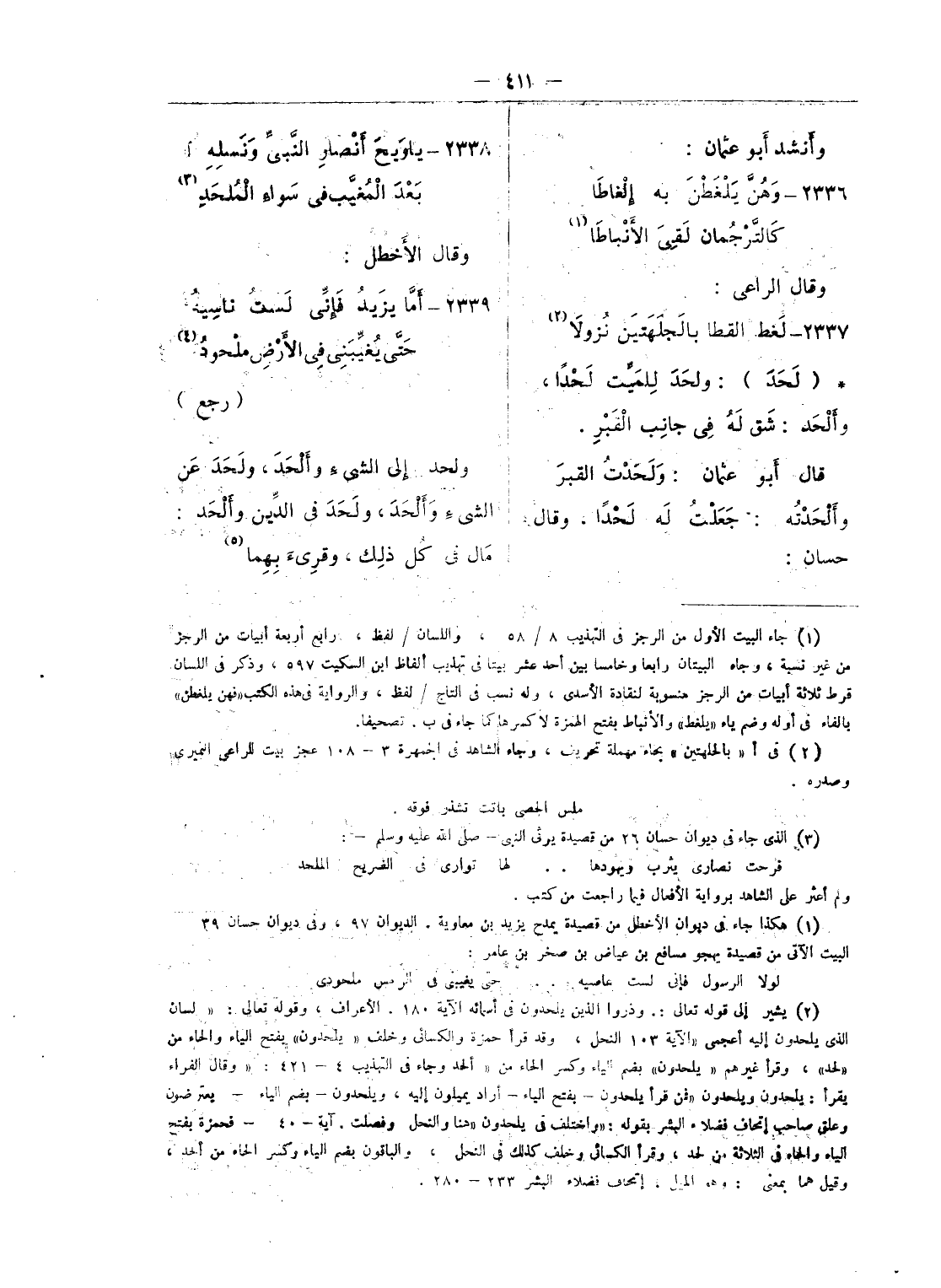 قال أبو عثمان: قال أبو بكر: لحمت الشئ وألحمته: لأمته، وقال غيره لحمت الرّجل وألحمته: قتلته (¬2) (حتى) (¬3) صار لحما، ولحم هو، فهو لحيم إذا كان مقتولا، وأنشد أبو عمرو (¬4) بن العلاء لساعدة بن جؤية الهذلى: