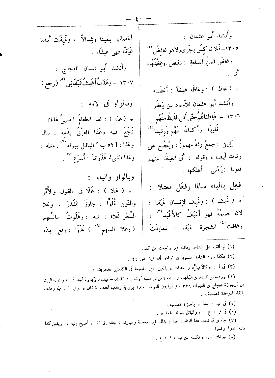 (¬6) جاء فى إصلاح المنطق 213/ 227 برواية «الأثناء مكان» «الأنساء فى أب من غير نسبة، وهكذا ورد فى اللسان - غوى وورد فى التهذيب 8/ 218 غير منسوب كذلك برواية «الأنثاء» بنون ثم ثاء مثلثة.