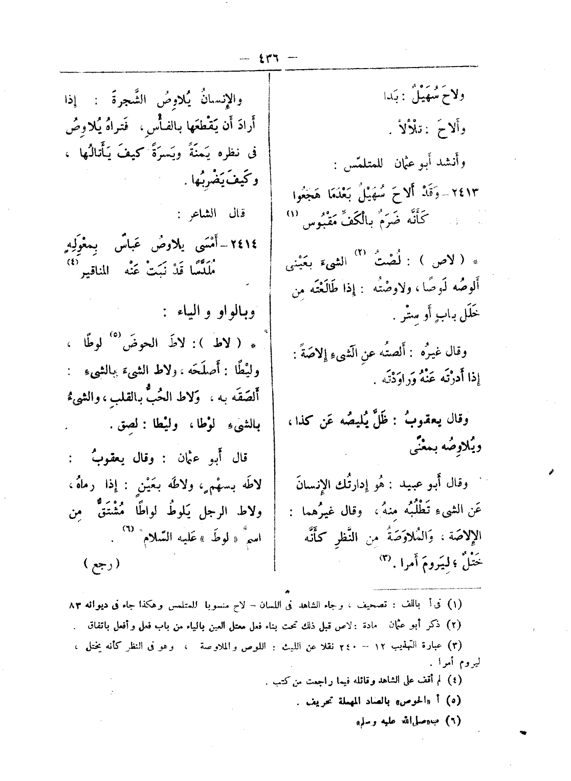 (¬6) وضع أبو عثمان الفعل «لخى» تحت بناء معتل العين، وحقه أن يوضع تحت معتل اللام. وجاء فى ق:
