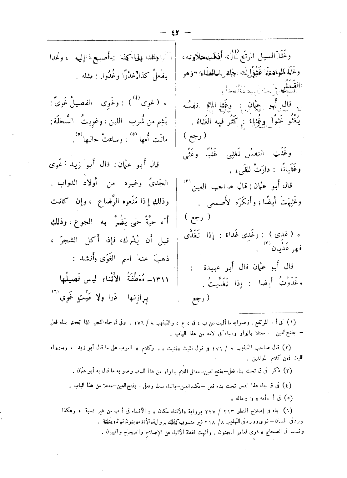 (¬4) جاء فى ق تحت بناء المعتل بالياء من الرباعى على أفعل مادة أغفى وعبارته: «وأغفى: نام، والشجر: تدلت أغصانه». وقد ذكرها أبو عثمان تحت بناء فعل - بفتح العين - معتل اللام بالواو فى الثلاثى من باب فعل وأفعل باختلاف.