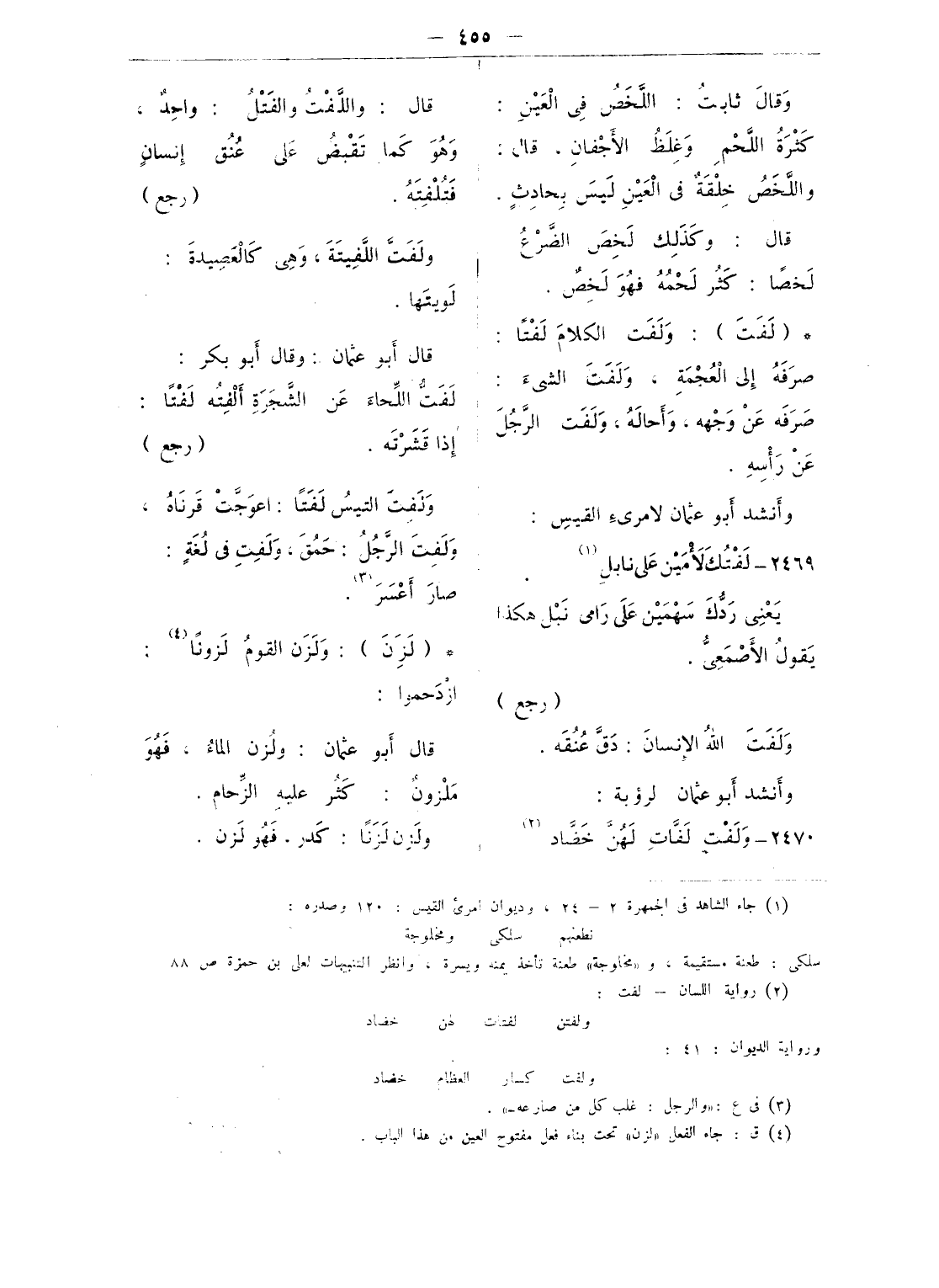 ومنه قول عمر بن الخطاب رضى الله عنه (¬2): «تعلّموا الفرائض، والسّنّة، واللّحن، كما تعلّمون القرآن» (¬3) واللّحن: اللّغة. (رجع)