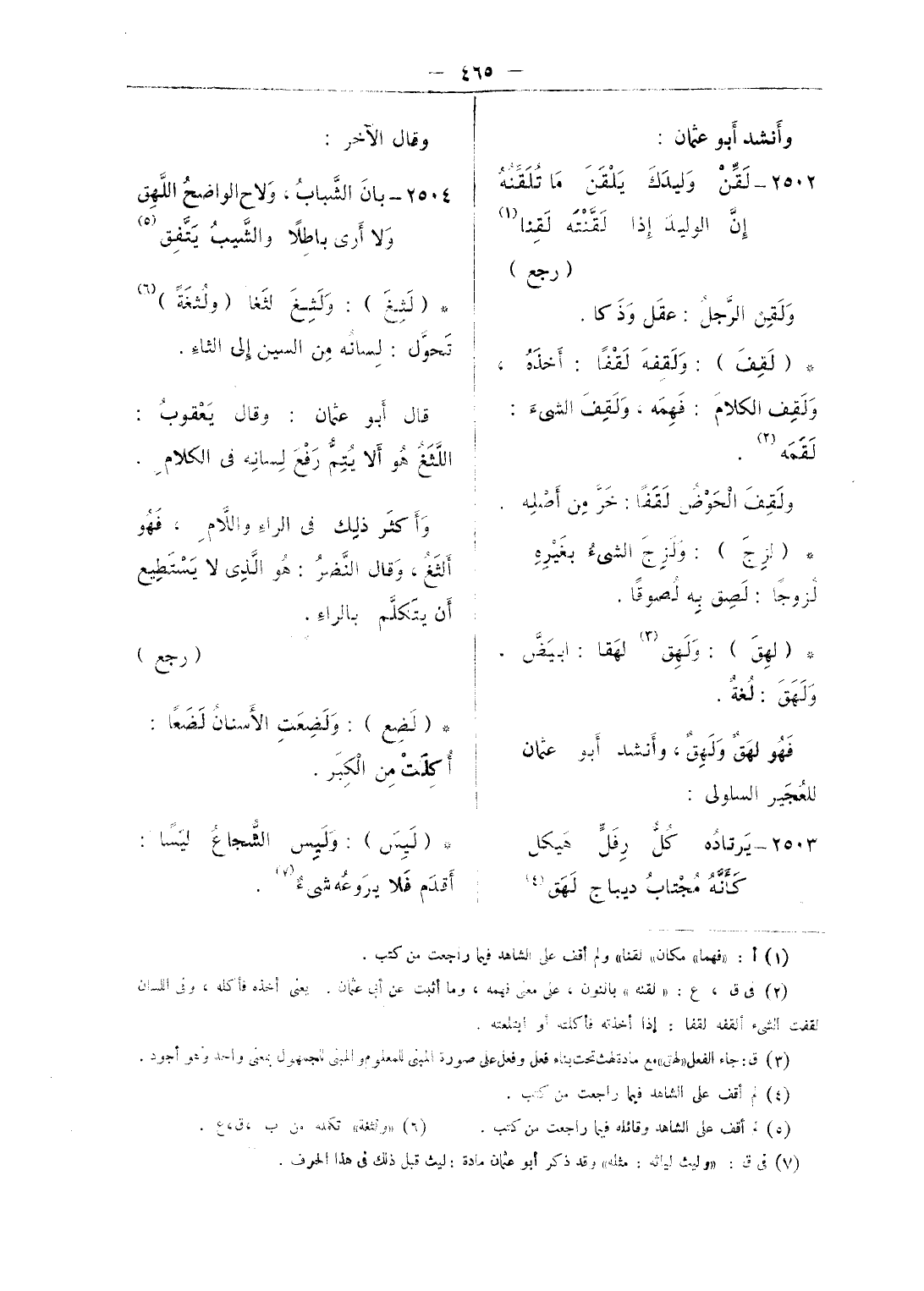 (¬4) جاء الشاهد فى التهذيب 4 - 361، واللسان - لحز من غير نسبة، ونسب فى تهذيب الألفاظ 75 لعمرو بن كلثوم، وعلق التبريزى على الشاهد بقوله، فى أمرت ضمير يعود إلى الخمر أو إلى الكأس و «لماله» فى صلة مهينا.