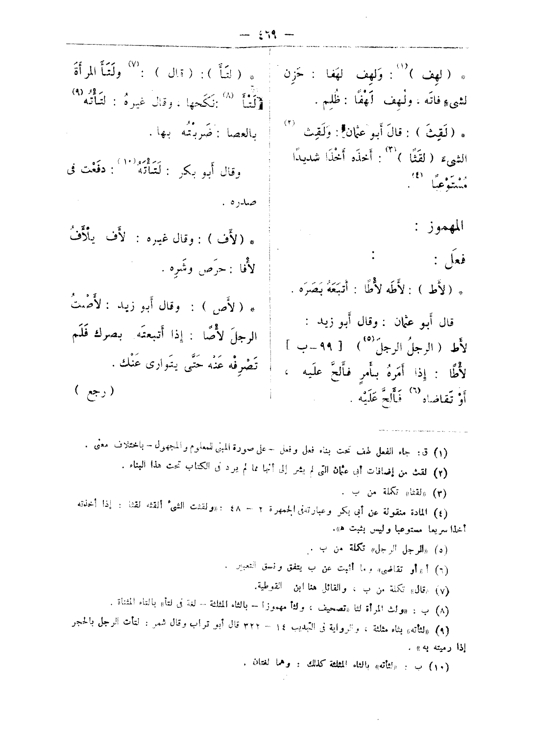 (¬5) تحتاج عبارة أبى عثمان إلى إيضاح، والذى وجدته فى الجمهرة 3/ 88 والتهذيب 12/ 241 نقلا عن أبى عبيد: «قيل لامرأة من العرب: إن فلانا قد هجاك فقالت ماقفا ولا لصا، تقول: لم يقذفنى».