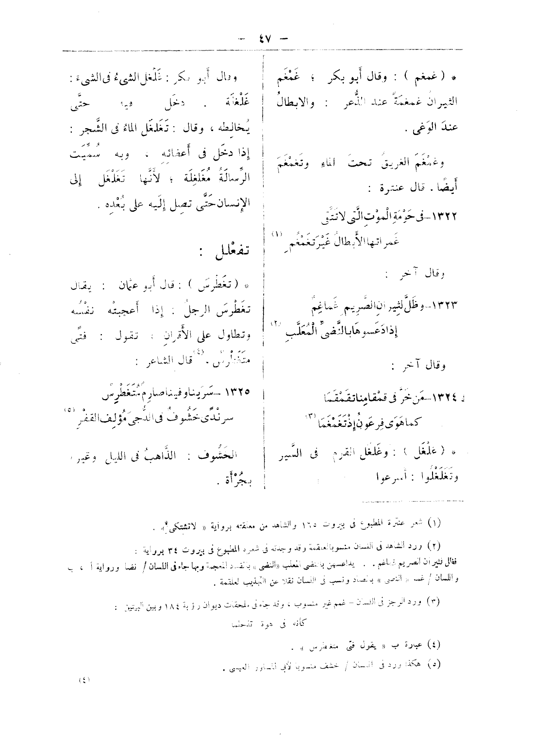 (¬5) العبارة ما بعد» شيئا» إلى هنا إما تكرار للعبارة التى قبلها تكرار تفسير وبيان، وإما أن العبارة» ويقال اغتفت: إذا نالت من الغفة، وهى البلغة من العيش» وسقطت عبارة «ويقال اغتفت» من النسختين عند النقل.