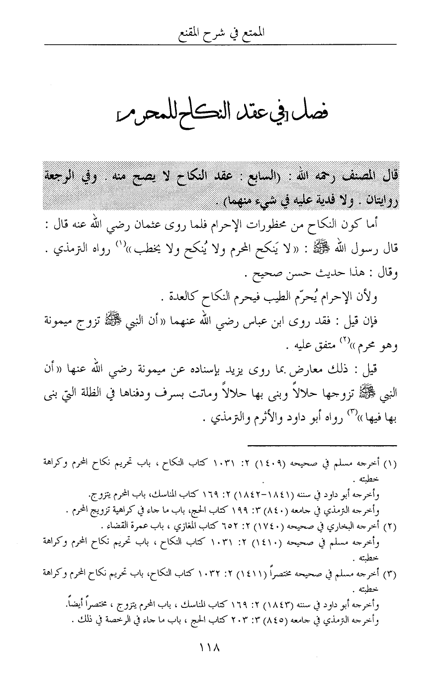 أما كون النكاح من محظورات الإحرام فلما روى عثمان رضي الله عنه قال: قال رسول الله صلى الله عليه وسلم: «لا يَنكح المحرم ولا يُنكح ولا يخطب» (¬1) رواه الترمذي. وقال: هذا حديث حسن صحيح.