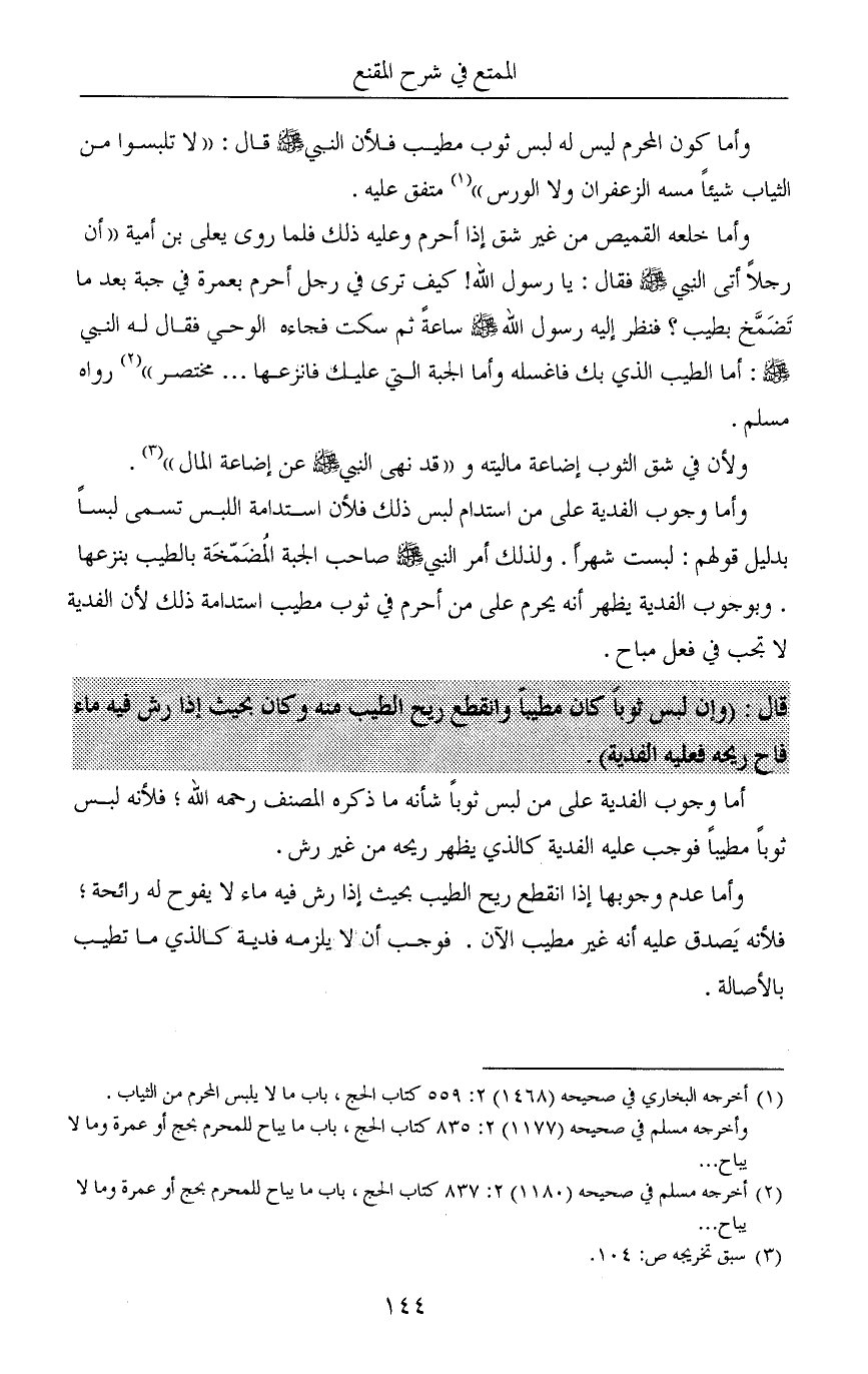 وأما كون المحرم ليس له لبس ثوب مطيب فلأن النبي صلى الله عليه وسلم قال: «لا تلبسوا من الثياب شيئاً مسه الزعفران ولا الورس» (¬1) متفق عليه.