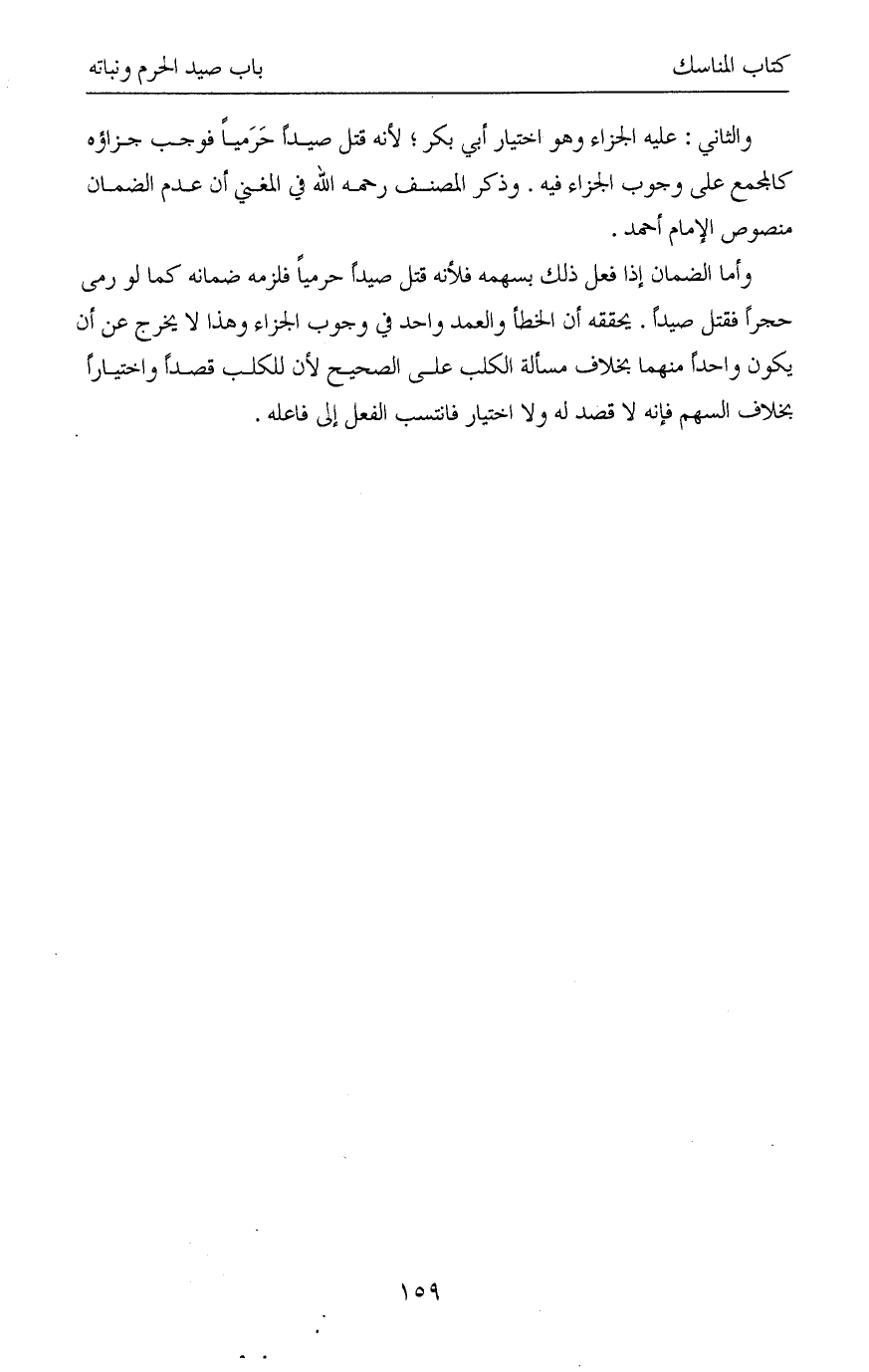والثاني: عليه الجزاء وهو اختيار أبي بكر؛ لأنه قتل صيداً حَرَمياً فوجب جزاؤه كالمجمع على وجوب الجزاء فيه. وذكر المصنف رحمه الله في المغني أن عدم الضمان منصوص الإمام أحمد.