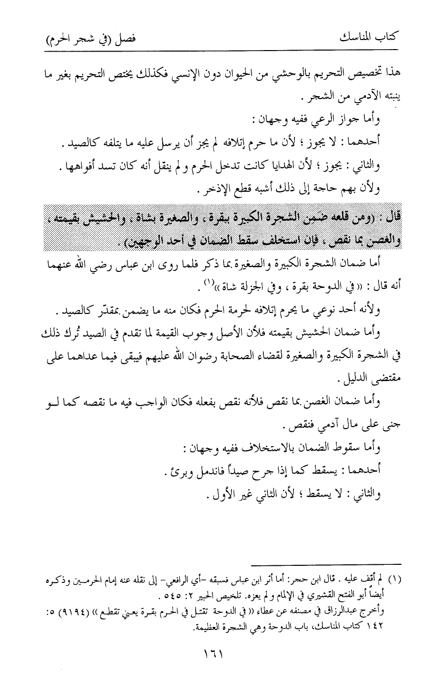 وأما ضمان الحشيش بقيمته فلأن الأصل وجوب القيمة لما تقدم في الصيد تُرك ذلك في الشجرة الكبيرة والصغيرة لقضاء الصحابة رضوان الله عليهم فيبقى فيما عداهما على مقتضى الدليل.