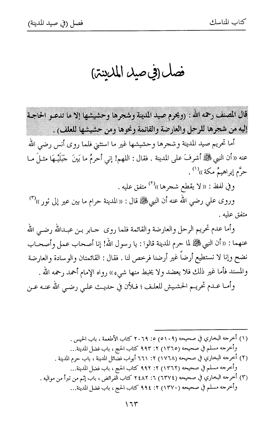 قال المصنف رحمه الله: (ويحرم صيد المدينة وشجرها وحشيشها إلا ما تدعو الحاجة إليه من شجرها للرحل والعارضة والقائمة ونحوها ومن حشيشها للعلف).