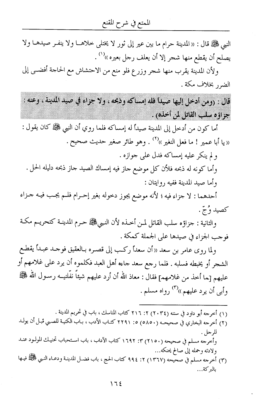 والثانية: جزاؤه سلب القاتل لمن أخذه لأن النبي صلى الله عليه وسلم حرم المدينة كتحريم مكة فوجب الجزاء في صيدها على الجملة كمكة.