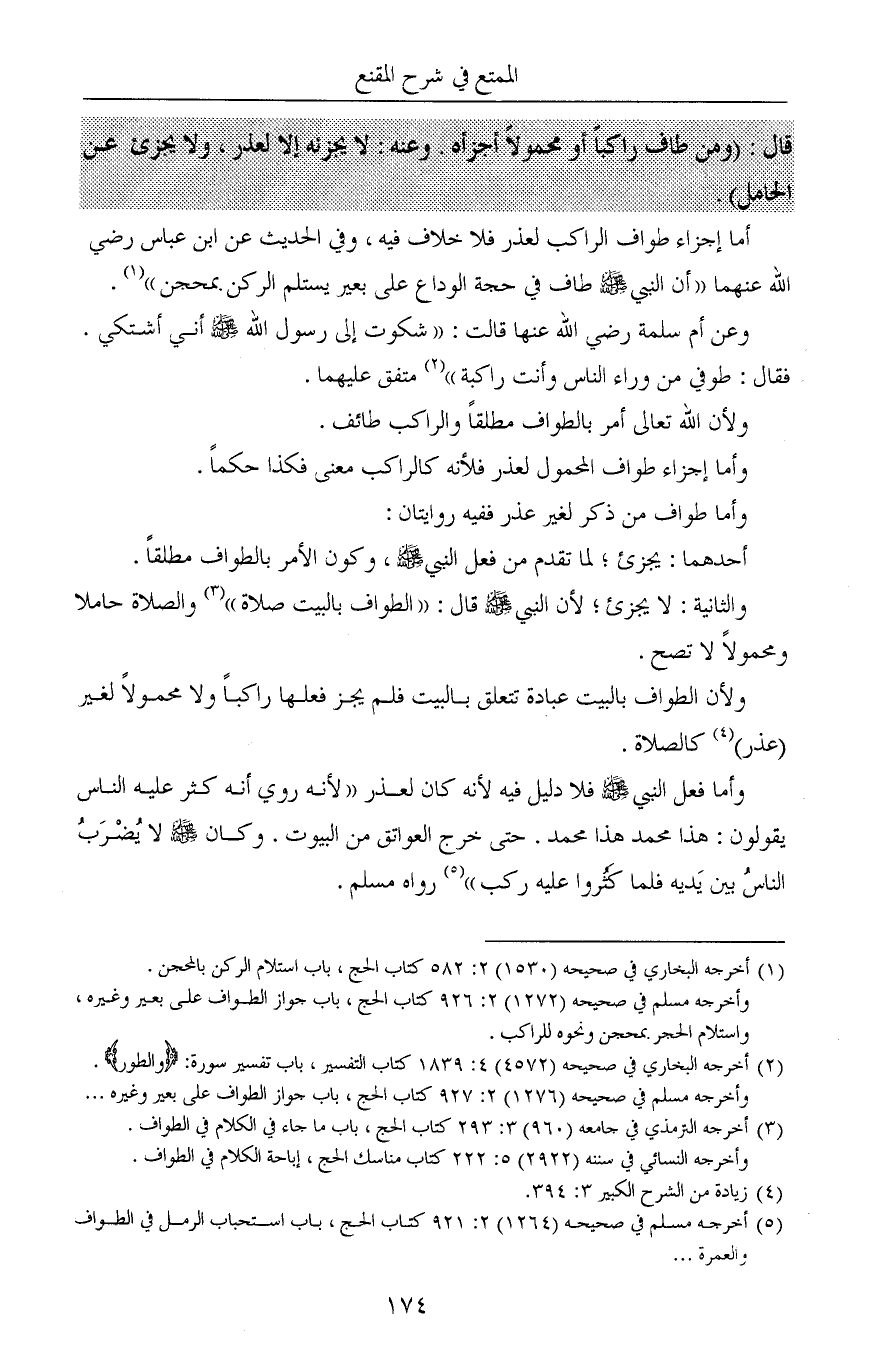 وعن أم سلمة رضي الله عنها قالت: «شكوت إلى رسول الله صلى الله عليه وسلم أني أشتكي. فقال: طوفي من وراء الناس وأنت راكبة» (¬2) متفق عليهما.