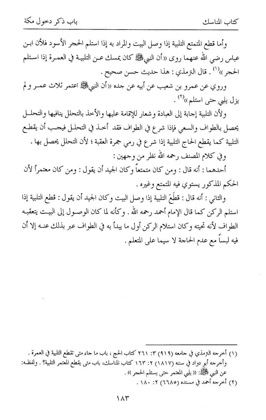 (¬1) أخرجه الترمذي في جامعه (919) 3: 261 كتاب الحج، باب ما جاء متى تقطع التلبية في العمرة.