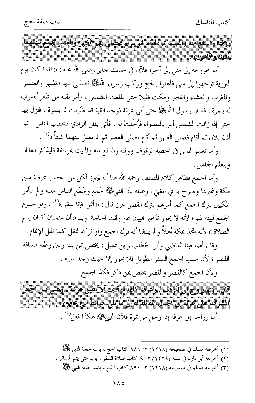 أما خروجه إلى منى إلى آخره فلأن في حديث جابر رضي الله عنه: «فلما كان يوم التروية توجهوا إلى منى فأهلوا بالحج وركب رسول الله صلى الله عليه وسلم فصلى بها الظهر والعصر والمغرب والعشاء والفجر ومكث قليلاً حتى طلعت الشمس، وأمر بقبة من شَعر تُضرب له بنمرة. فسار رسول الله صلى الله عليه وسلم حتى أتى عرفة فوجد القبة قد ضُربت له بنمرة. فنزل بها حتى إذا زالت الشمس أمر بالقصواء فرُحِّلَتْ له. فأتى بطن الوادي فخطب الناس. ثم أذن بلال ثم أقام فصلى الظهر ثم أقام فصلى العصر ثم لم يصل بينهما شيئاً» (¬1).