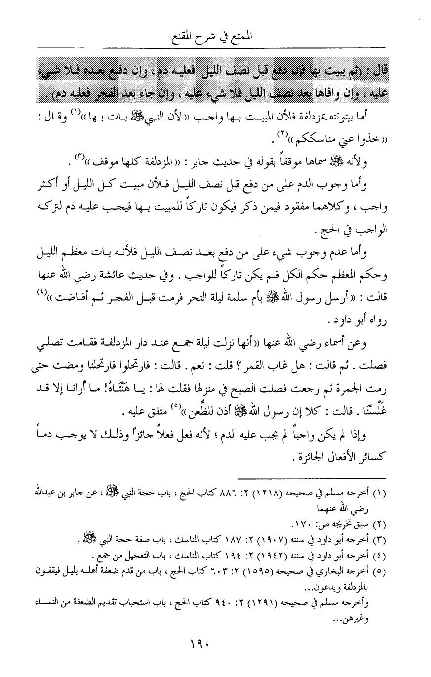 (¬5) أخرجه البخاري في صحيحه (1595) 2: 603 كتاب الحج، باب من قدم ضعفة أهله بليل فيقفون بالمزدلفة ويدعون ...