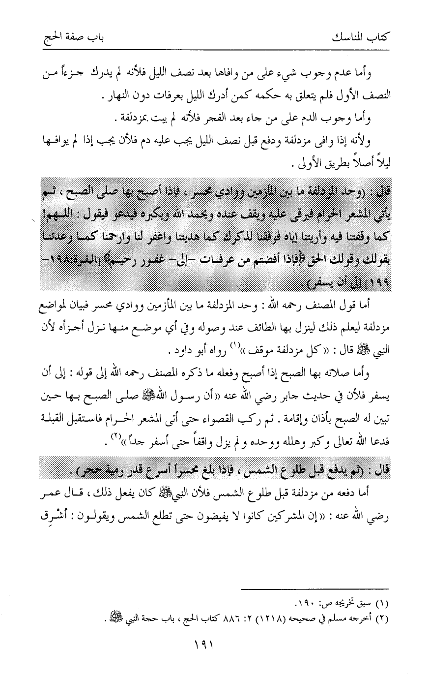 قال: (ثم يدفع قبل طلوع الشمس، فإذا بلغ محسراً أسرع قدر رمية حجر).