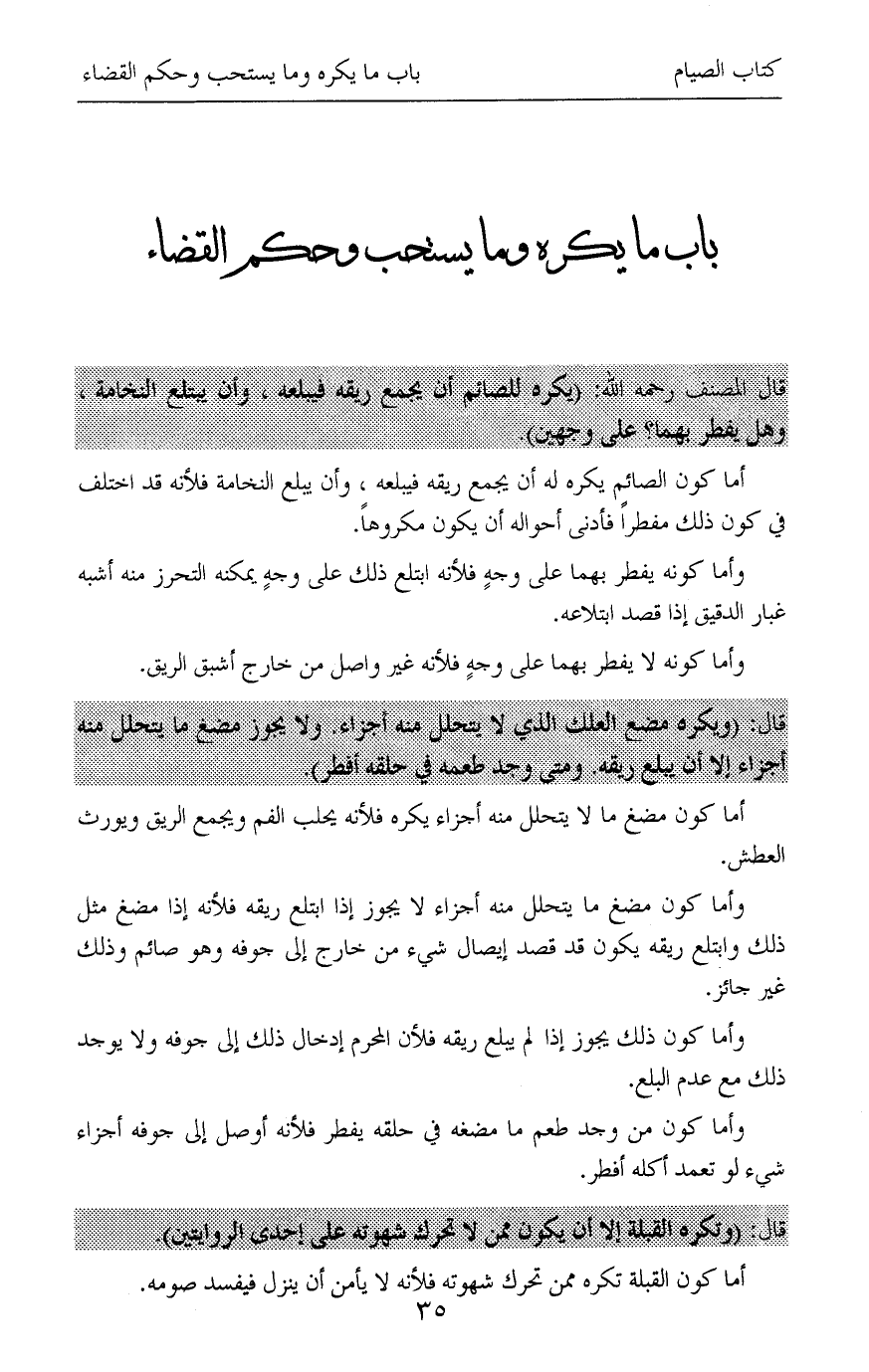 قال: (ويكره مضع العلك الذي لا يتحلل منه أجزاء. ولا يجوز مضغ ما يتحلل منه أجزاء إلا أن يبلع ريقه. ومتى وجد طعمه في حلقه أفطر).