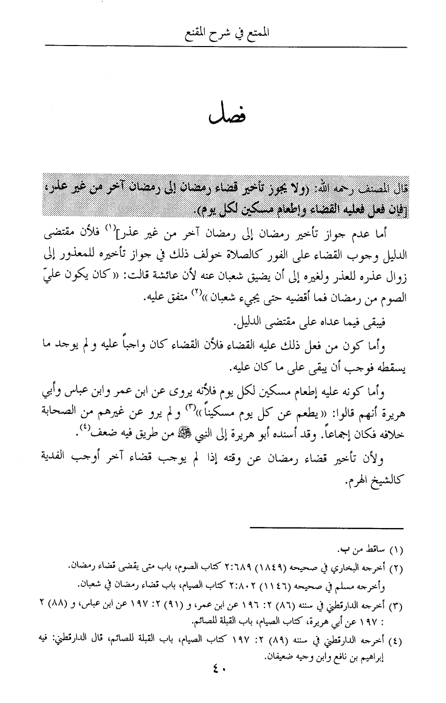 قال المصنف رحمه الله: (ولا يجوز تأخير قضاء رمضان إلى رمضان آخر من غير عذر، [فإن فعل فعليه القضاء وإطعام مسكين لكل يوم).