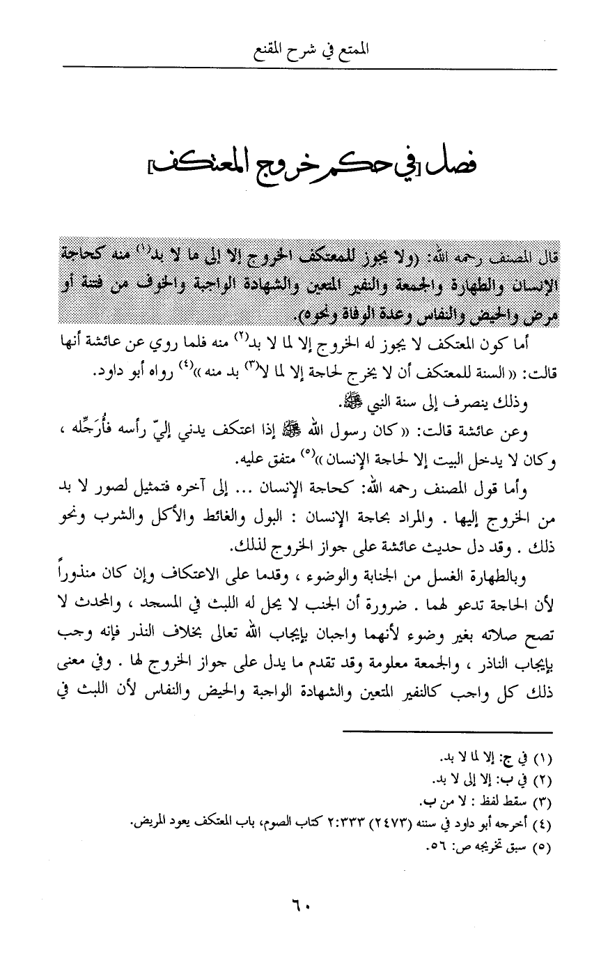 قال المصنف رحمه الله: (ولا يجوز للمعتكف الخروج إلا إلى ما لا بد (¬1) منه كحاجة الإنسان والطهارة والجمعة والنفير المتعين والشهادة الواجبة والخوف من فتنة أو مرض والحيض والنفاس وعدة الوفاة ونحوه).
