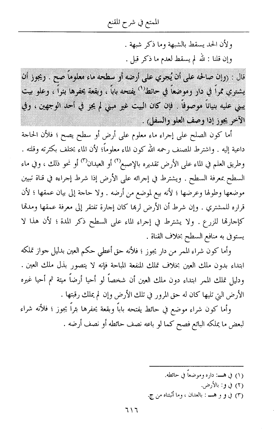 أما كون الصلح على إجراء ماء معلوم على أرض أو سطح يصح؛ فلأن الحاجة داعية إليه. واشترط المصنف رحمه الله كون الماء معلوماً؛ لأن الماء يختلف بكثرته وقلته. وطريق العلم في الماء على الأرض تقديره بالإصبع (¬2) أو العيدان (¬3) أو نحو ذلك، وفي ماء السطح بمعرفة السطح. ويشترط في إجرائه على الأرض إذا شرط إجراءه في قناة تبيين موضعها وطولها وعرضها؛ لأنه بيع لموضع من أرضه. ولا حاجة إلى بيان عمقها؛ لأن قراره للمشتري. وإن شرط أن الأرض لربها كان إجارة تفتقر إلى معرفة عمقها ومدتها كإجارتها للزرع. ولا يشترط في إجراء الماء على السطح ذكر المدة؛ لأن هذا لا يستوفى به منافع السطح بخلاف القناة.