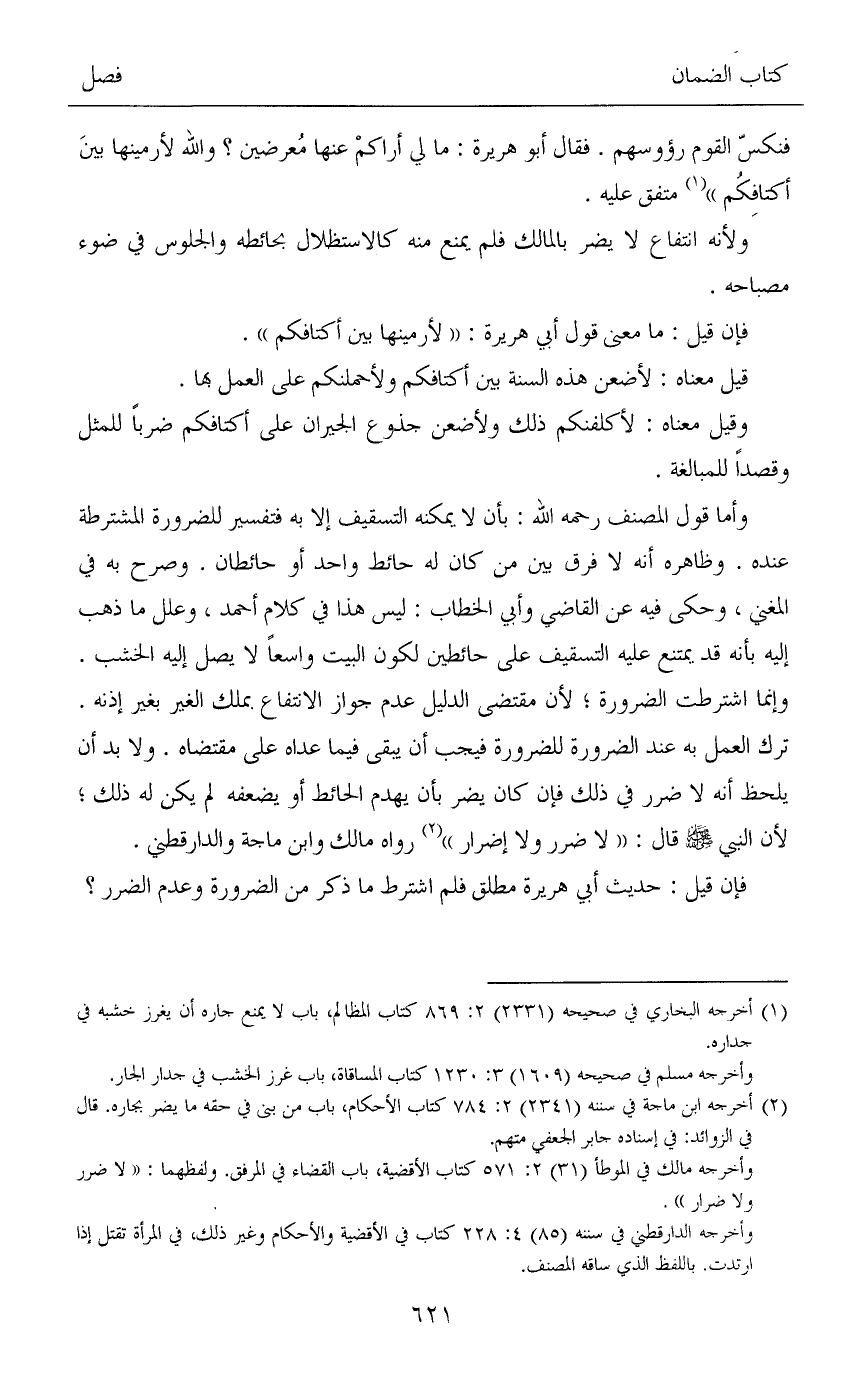 وأما قول المصنف رحمه الله: بأن لا يمكنه التسقيف إلا به فتفسير للضرورة المشترطة عنده. وظاهره أنه لا فرق بين من كان له حائط واحد أو حائطان. وصرح به في المغني، وحكى فيه عن القاضي وأبي الخطاب: ليس هذا في كلام أحمد، وعلل ما ذهب إليه بأنه قد يمتنع عليه التسقيف على حائطين لكون البيت واسعاً لا يصل إليه الخشب. وإنما اشترطت الضرورة؛ لأن مقتضى الدليل عدم جواز الانتفاع بملك الغير بغير إذنه. ترك العمل به عند الضرورة للضرورة فيجب أن يبقى فيما عداه على مقتضاه. ولا بد أن يلحظ أنه لا ضرر في ذلك فإن كان يضر بأن يهدم الحائط أو يضعفه لم يكن له ذلك؛ لأن النبي صلى الله عليه وسلم قال: «لا ضرر ولا إضرار» (¬2) رواه مالك وابن ماجة والدارقطني.