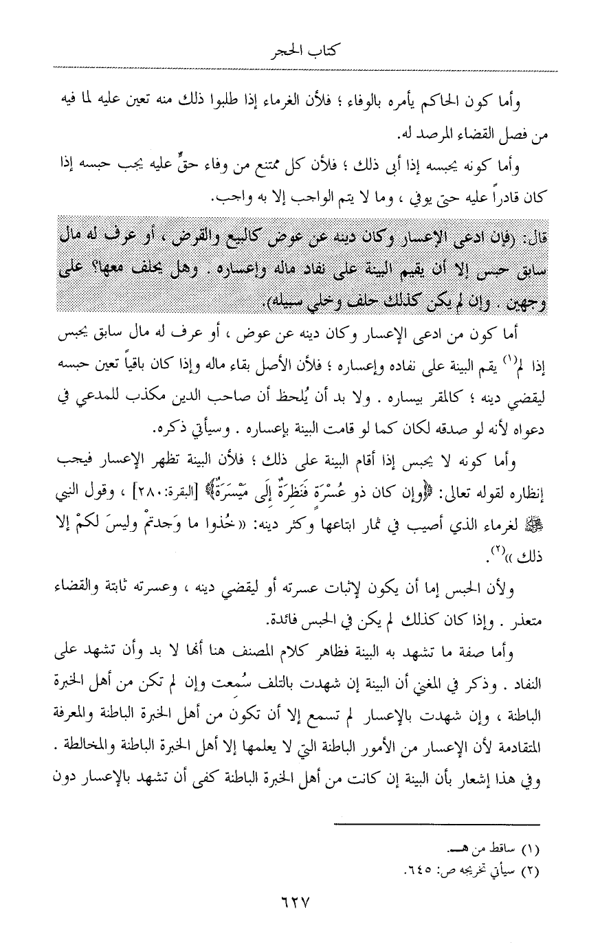 أما كون من ادعى الإعسار وكان دينه عن عوض، أو عرف له مال سابق يحبس إذا لم (¬1) يقم البينة على نفاده وإعساره؛ فلأن الأصل بقاء ماله وإذا كان باقياً تعين حبسه ليقضي دينه؛ كالمقر بيساره. ولا بد أن يُلحظ أن صاحب الدين مكذب للمدعي في دعواه لأنه لو صدقه لكان كما لو قامت البينة بإعساره. وسيأتي ذكره.