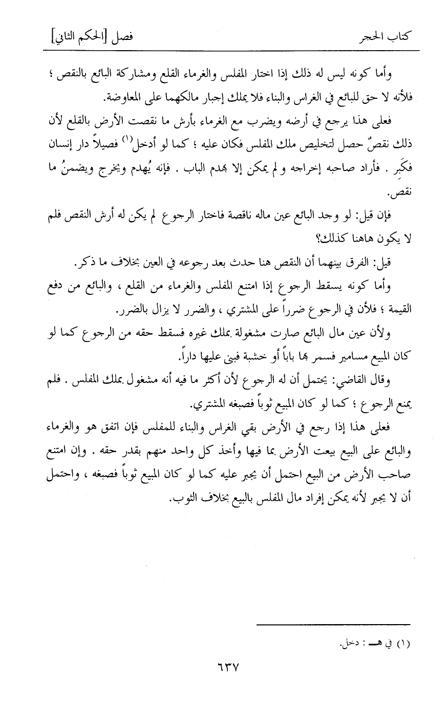 فعلى هذا يرجع في أرضه ويضرب مع الغرماء بأرش ما نقصت الأرض بالقلع لأن ذلك نقصٌ حصل لتخليص ملك المفلس فكان عليه؛ كما لو أدخل (¬1) فصيلاً دار إنسان فكَبِر. فأراد صاحبه إخراجه ولم يمكن إلا بهدم الباب. فإنه يُهدم ويخرج ويضمنُ ما نقص.