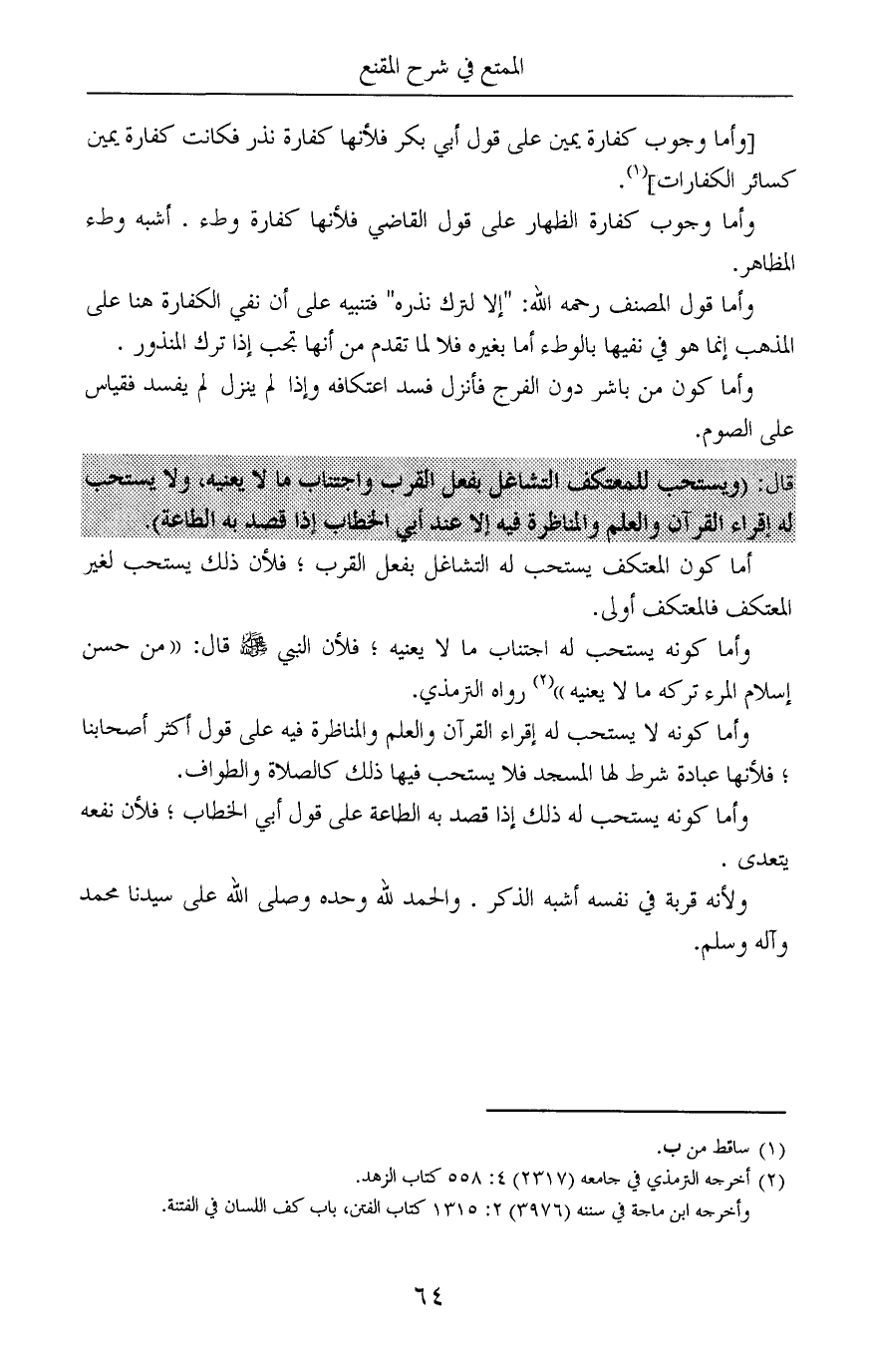 وأما كونه يستحب له اجتناب ما لا يعنيه؛ فلأن النبي صلى الله عليه وسلم قال: «من حسن إسلام المرء تركه ما لا يعنيه» (¬2) رواه الترمذي.