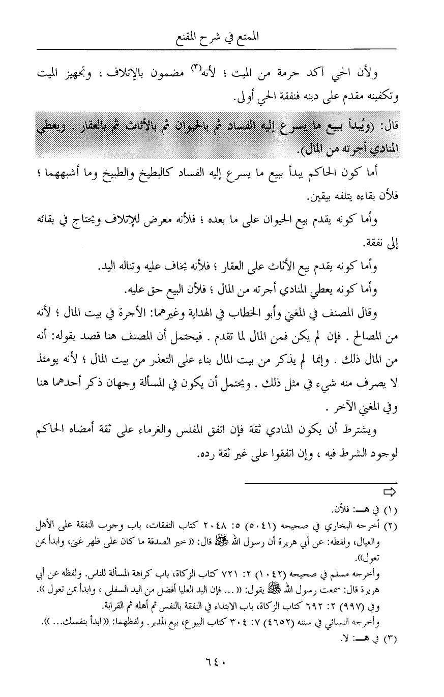 قال: (ويُبدأ ببيع ما يسرع إليه الفساد ثم بالحيوان ثم بالأثاث ثم بالعقار. ويعطي المنادي أجرته من المال).