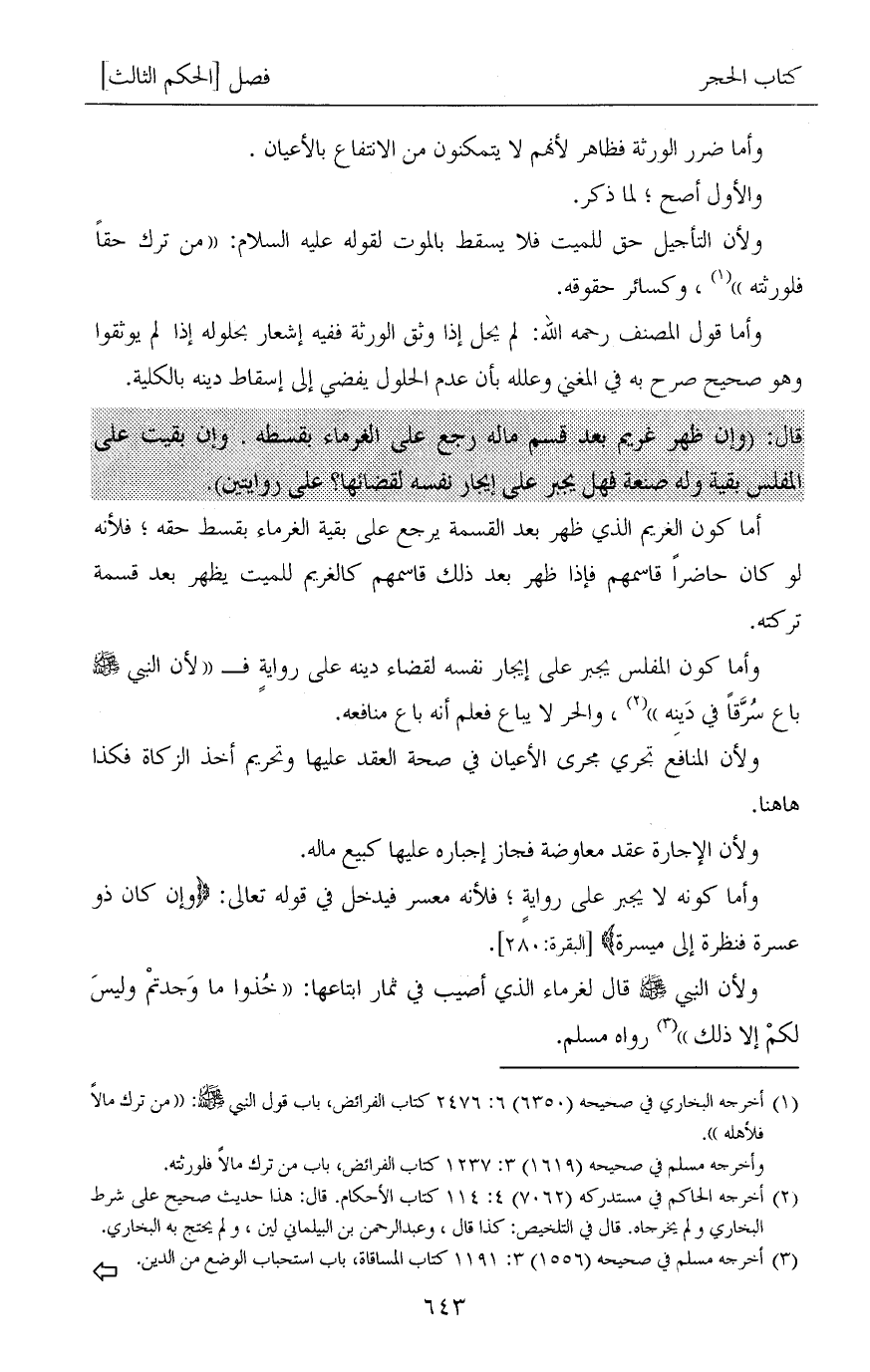(¬1) أخرجه البخاري في صحيحه (6350) 6: 2476 كتاب الفرائض، باب قول النبي صلى الله عليه وسلم: «من ترك مالاً فلأهله».