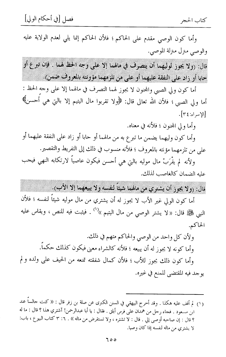 أما كون ولي الصبي والمجنون لا يجوز لهما التصرف في مالهما إلا على وجهٍ الحظ: أما ولي الصبي؛ فلأن الله تعالى قال: {ولا تقربوا مال اليتيم إلا بالتي هي أحسن} [الإسراء: 34].