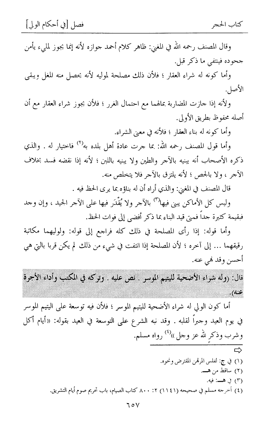 أما كون الولي له شراء الأضحية لليتيم الموسر؛ فلأن فيه توسعة على اليتيم الموسر في يوم العيد وجبراً لقلبه. وقد نبه الشرع على التوسعة في العيد بقوله: «أيام أكل وشرب وذكرٍ لله عز وجل» (¬3) رواه مسلم.