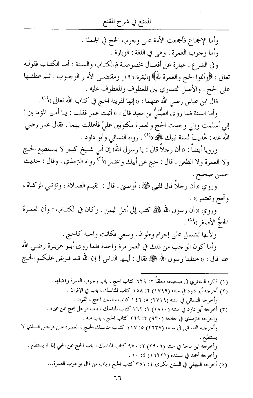 وأما السنة فما روى الصُّبَيُّ بن معبد قال: «أتيت عمر فقلت: يا أمير المؤمنين! إني أسلمت وإني وجدت الحج والعمرة مكتوبين عليّ فأهللت بهما. فقال عمر رضي الله عنه: هُديتَ لسنة نبيك صلى الله عليه وسلم» (¬2). رواه النسائي وأبو داود.