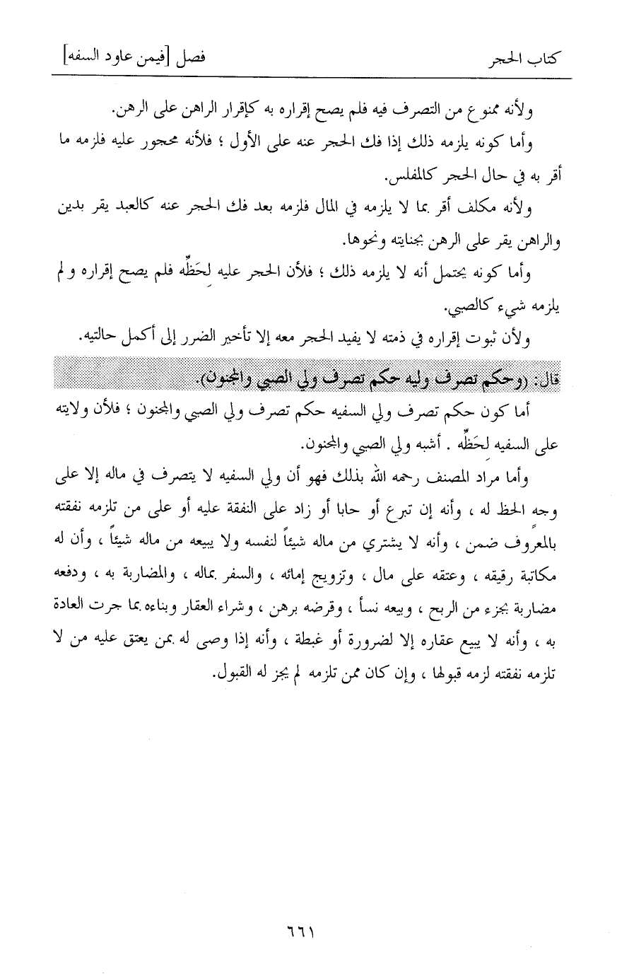 وأما مراد المصنف رحمه الله بذلك فهو أن ولي السفيه لا يتصرف في ماله إلا على وجهٍ الحظ له، وأنه إن تبرع أو حابا أو زاد على النفقة عليه أو على من تلزمه نفقته بالمعروف ضمن، وأنه لا يشتري من ماله شيئاً لنفسه ولا يبيعه من ماله شيئاً، وأن له مكاتبة رقيقه، وعتقه على مال، وتزويج إمائه، والسفر بماله، والمضاربة به، ودفعه مضاربة بجزء من الربح، وبيعه نسأ، وقرضه برهن، وشراء العقار وبناءه بما جرت العادة به، وأنه لا يبيع عقاره إلا لضرورة أو غبطة، وأنه إذا وصى له بمن يعتق عليه من لا تلزمه نفقته لزمه قبولها، وإن كان ممن تلزمه لم يجز له القبول.