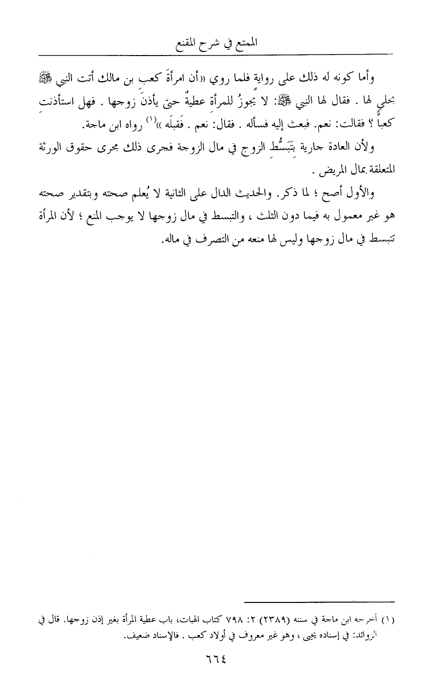 (¬1) أخرجه ابن ماجة في سننه (2389) 2: 798 كتاب الهبات، باب عطية المرأة بغير إذن زوجها. قال في الزوائد: في إسناده يحيى، وهو غير معروف في أولاد كعب. فالإسناد ضعيف.