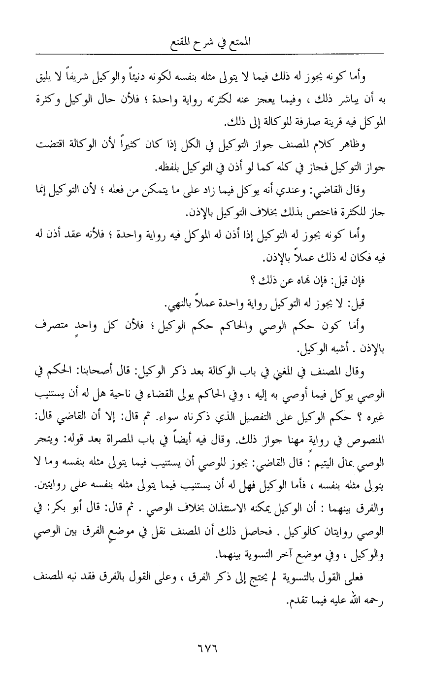 وقال المصنف في المغني في باب الوكالة بعد ذكر الوكيل: قال أصحابنا: الحكم في الوصي يوكل فيما أوصي به إليه، وفي الحاكم يولى القضاء في ناحية هل له أن يستنيب غيره؟ حكم الوكيل على التفصيل الذي ذكرناه سواء. ثم قال: إلا أن القاضي قال: المنصوص في روايةٍ مهنا جواز ذلك. وقال فيه أيضاً في باب المصراة بعد قوله: ويتجر الوصي بمال اليتيم: قال القاضي: يجوز للوصي أن يستنيب فيما يتولى مثله بنفسه وما لا يتولى مثله بنفسه، فأما الوكيل فهل له أن يستنيب فيما يتولى مثله بنفسه على روايتين. والفرق بينهما: أن الوكيل يمكنه الاستئذان بخلاف الوصي. ثم قال: قال أبو بكر: في الوصي روايتان كالوكيل. فحاصل ذلك أن المصنف نقل في موضعٍ الفرق بين الوصي والوكيل، وفي موضع آخر التسوية بينهما.