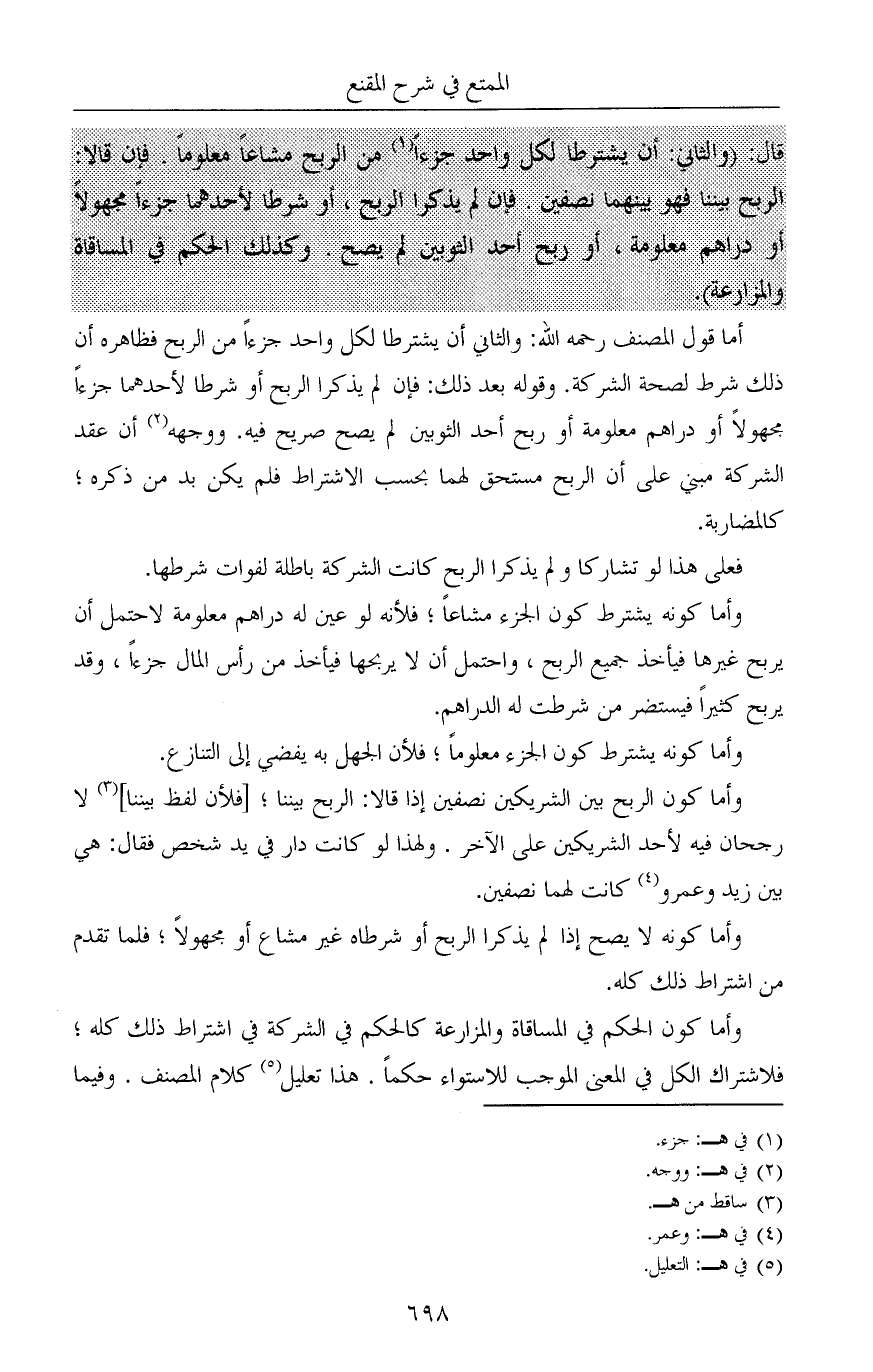 أما قول المصنف رحمه الله: والثاني أن يشترطا لكل واحد جزءاً من الربح فظاهره أن ذلك شرط لصحة الشركة. وقوله بعد ذلك: فإن لم يذكرا الربح أو شرطا لأحدهما جزءاً مجهولاً أو دراهم معلومة أو ربح أحد الثوبين لم يصح صريح فيه. ووجهه (¬2) أن عقد الشركة مبني على أن الربح مستحق لهما بحسب الاشتراط فلم يكن بد من ذكره؛ كالمضاربة.