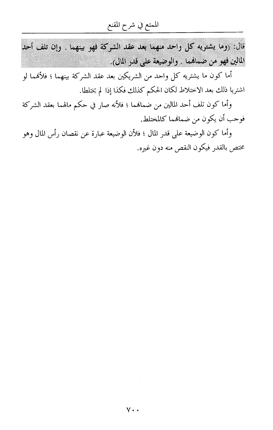 قال: (وما يشتريه كل واحد منهما بعد عقد الشركة فهو بينهما. وإن تلف أحد المالين فهو من ضمانهما. والوضيعة على قدر المال).