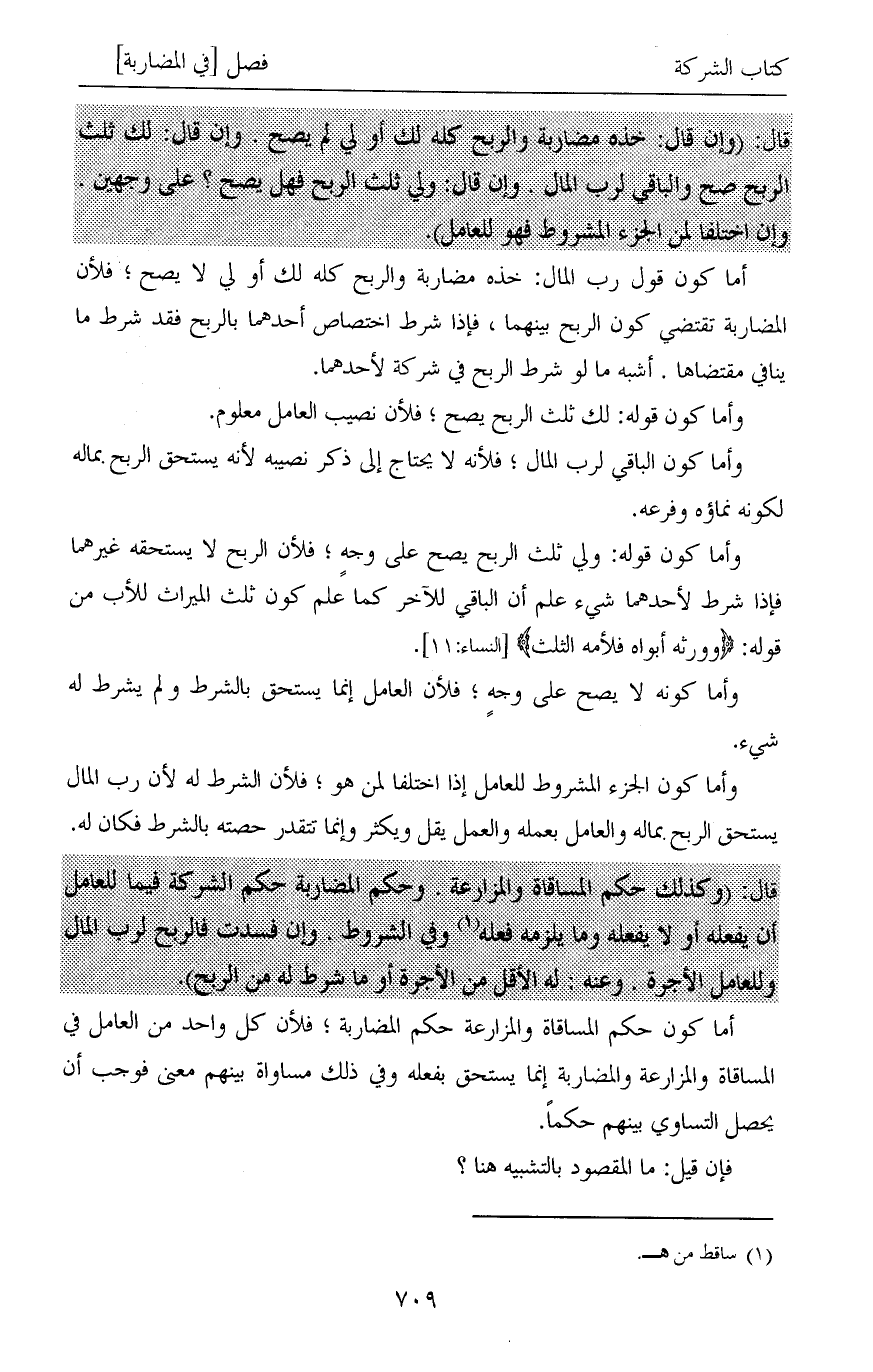 وأما كون الجزء المشروط للعامل إذا اختلفا لمن هو؛ فلأن الشرط له لأن رب المال يستحق الربح بماله والعامل بعمله والعمل يقل ويكثر وإنما تتقدر حصته بالشرط فكان له.
