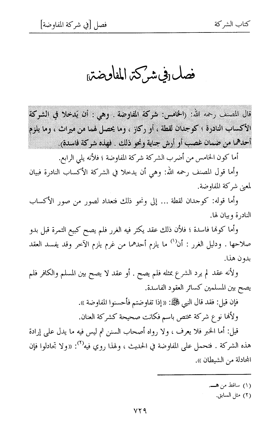 قيل: أما الخبر فلا يعرف، ولا رواه أصحاب السنن ثم ليس فيه ما يدل على إرادة هذه الشركة. فتحمل على المفاوضة في الحديث، ولهذا روي فيه (¬2): «ولا تجادلوا فإن المجادلة من الشيطان».